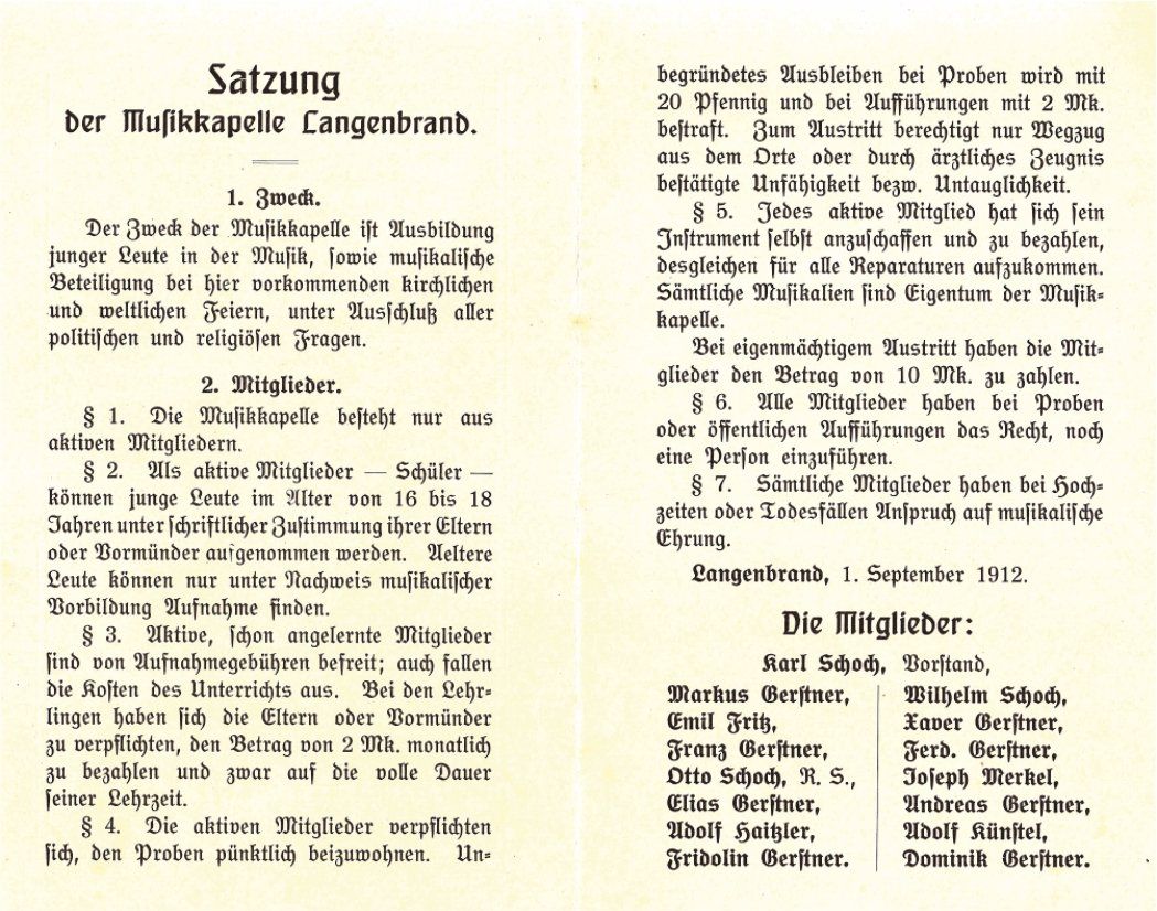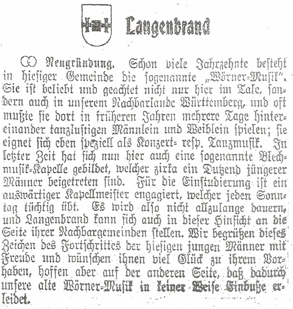 Aus diesen unterschiedlichen Quellen heraus lässt sich ableiten, dass es unterschiedliche musikalische Grup-pierungen in Langenbrand schon Jahre bzw. Jahrzehnte vor der Gründung der Musikkapelle am 7. April 1912 gab.